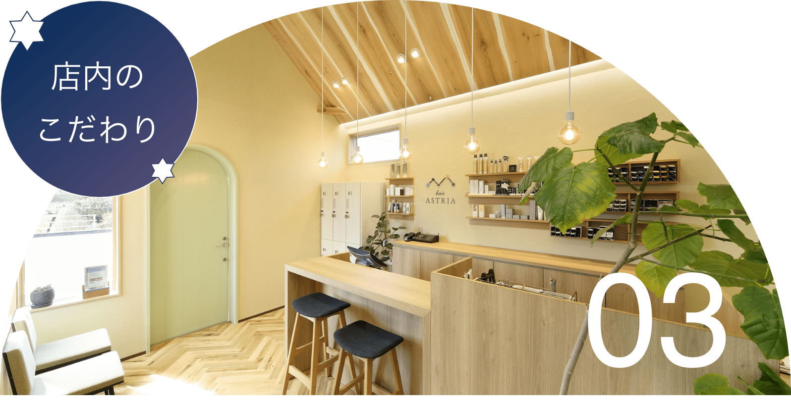 店内のインテリアは、お客様に心からリラックスしていただけるよう、細部までこだわり抜きました。